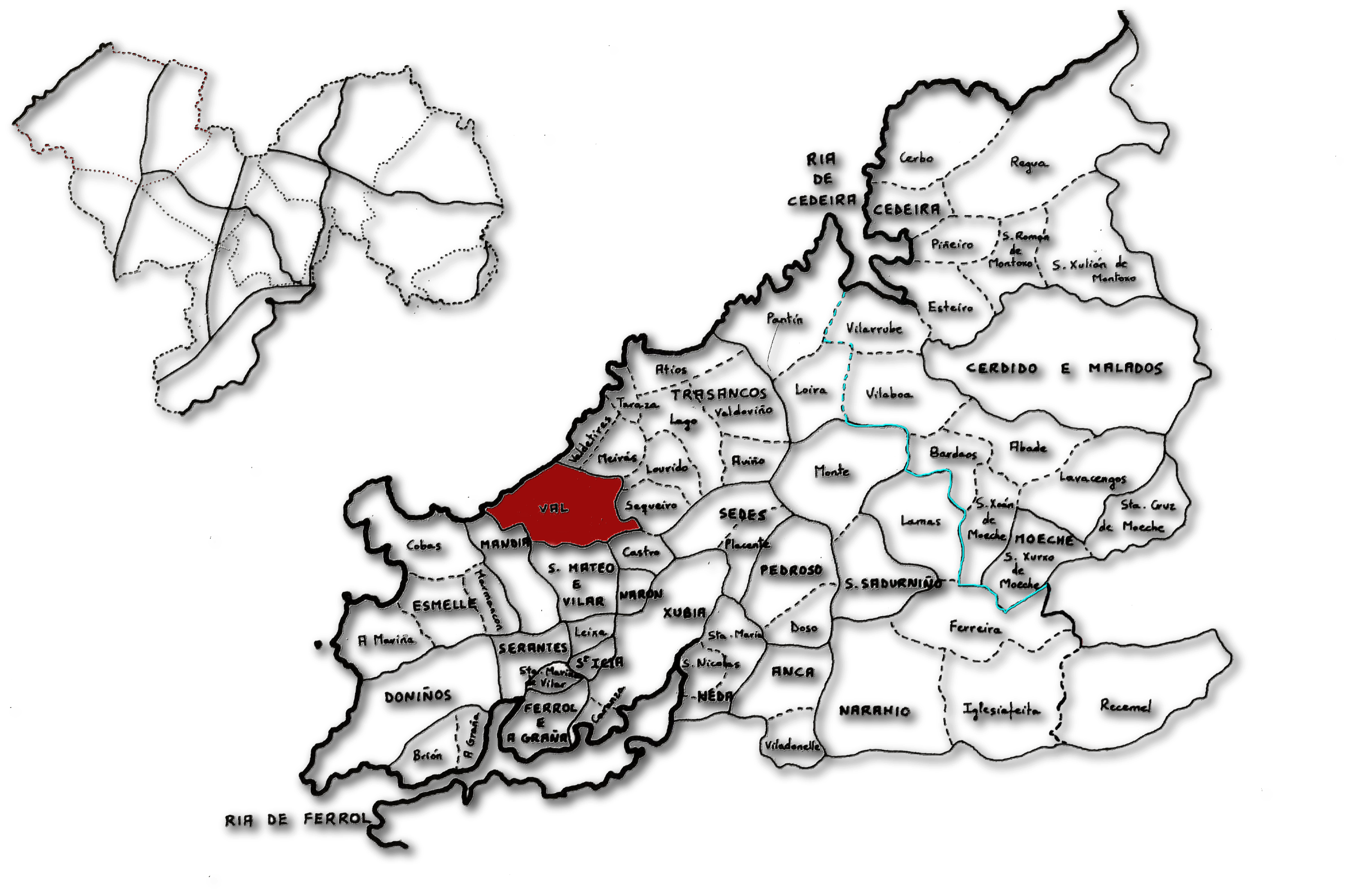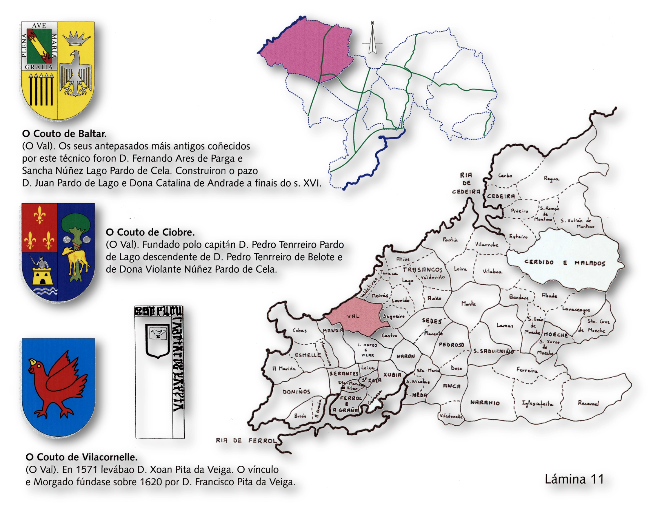 […] Quo modo obtinuit eas antecessor meus per terminos et diuisiones suas antiquas, id est uilla de Platanedo (Pradeedo, O Val, Narón), diuiditur per illam armatam et per illum carualium Pelagii Fernandi et per Arcam de Uados Pasandi (Arca de Vespasante, un túmulo que separa as frigresías do Val de San Mateu) et tornat se per castinariam de Aluare et per illam Portam Castri et inde ad Fontem Cecam. Hereditas de Quintana ubi eam inueneritis, hereditas de uilla Cornelli diuiditur per ubi se diuidit de Ciobre et quo modo se diuidit de Ualle Malo (logo estas uillae particulares determiñadas por marcos conformarían a frigresia de Sata Maria a Maior do Val, inexistente todavia a finales de 1173) et inde per Grandalem et inde ad Lamam Molinum”. Sobrado. Tumbo II n 420 fo. 142v, in Pilar de LOSCERTALES DE VALDEAVELLANO. Tumbos del Monasterio de Sobrado. Madrid. 1996.