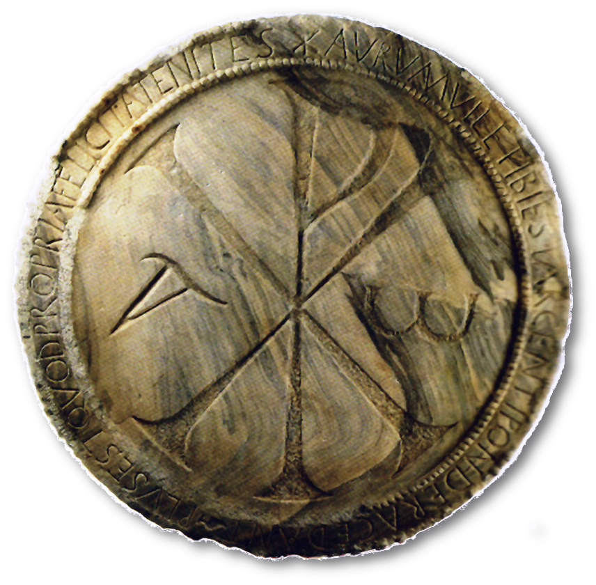 Crismón, psblm. mesa de ofrendas empregada como ara ata 1887, en Santa Maria da Ermida (Quiroga) de mármore de Oincio, de 95 cm de diámetro x 6 cm de grosor. A cara traballada inscribe entre duas cenefas de pérolas, rodeando o Chrismón coa Alfa e a Omega, o mais formoso epígrafe latino galego (ca. 450): AVRVM VILE TIBI EST ARGENTI PONDERA CEDANT PLVS EST QVOD PROPRIA FELICITATE NITES, “O ouro é ruín para tí, e tamén a prata. Mellor é que brilles coa propia felicidade“. Ex Wikipedia sub uocabulo Crismón de Quiroga
