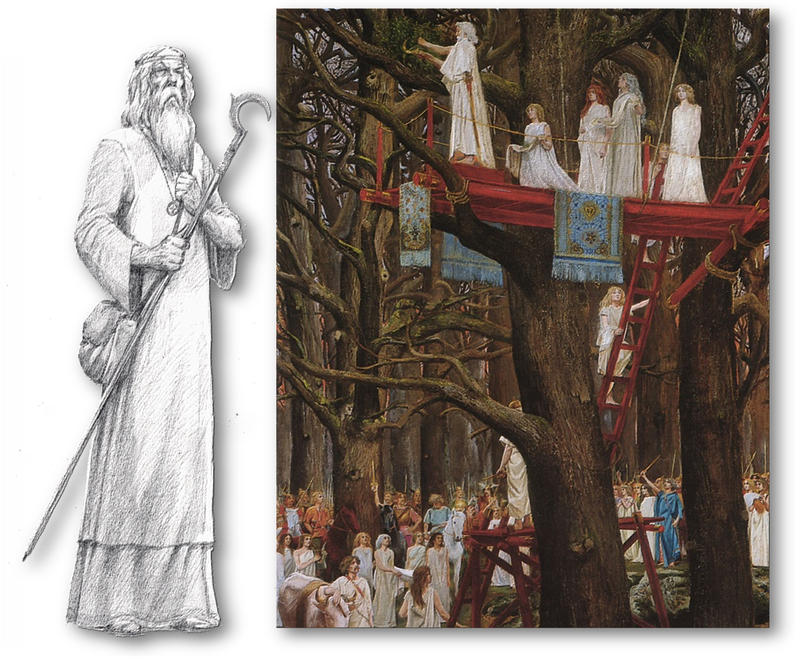 “Os druidas poden ter sido suprimidos como institución relixiosa e moral pola igrexa cristiá, pero eles e os seus acólitos deixaron tras si un sistema de valores culturais tan arraigado e tan estreitamente entrelazado coas institucións e coa ideoloxía longo tempo establecida, que parece ter subsistido en gran medida á transición ao cristianismo […]. ” Ex Proinsias Mac Cana The Cult of the Sacred Center [O culto do Centro Sagrado] (2.011), 60,61 [lémbrese que a igrexa Celta e jerárquica e universal, comparativamente similar – si se nos tolera – en organización, culto, piacula, e corpus dotrinal á presente Igrexa Católica. Esquerda druida, druvide , ou durvede, deseño de Carlos Alfonzo, [asesorado polo autor para o vestiario de Galaicus], Dereita “druidas cortando múerdago no couce da lúa” de Heri Paul Motte (1880-90)