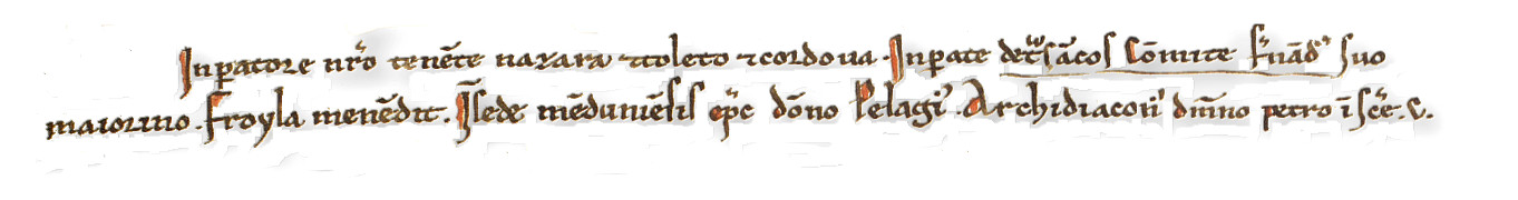 Es escusado repetir aquí la prueba de que los reyes designaban a los “comites” o “imperantes” que en su nombre regían los “comisa”, “comitatus”, o “mandationes” en que el reino se hallaba dividido; venían haciéndolo sus antecesores los reyes visigodos. No ha llegado hasta hoy ninguna de lates designaciones realizada por Alfonso III. Me parece empero seguro que en sus días estaba ya acuñada la fórmula legal de tales designaciones. Me permite Afirmarlo el paralelo entre el texto de la concesión de inmunidad a Sahagún por el rey Magno en 904, con el nombramiento por su nieto Alfonso IV a su tío D. Gutierre [pai de San Rosendo] en 929 para regir unos comissa gallegos.