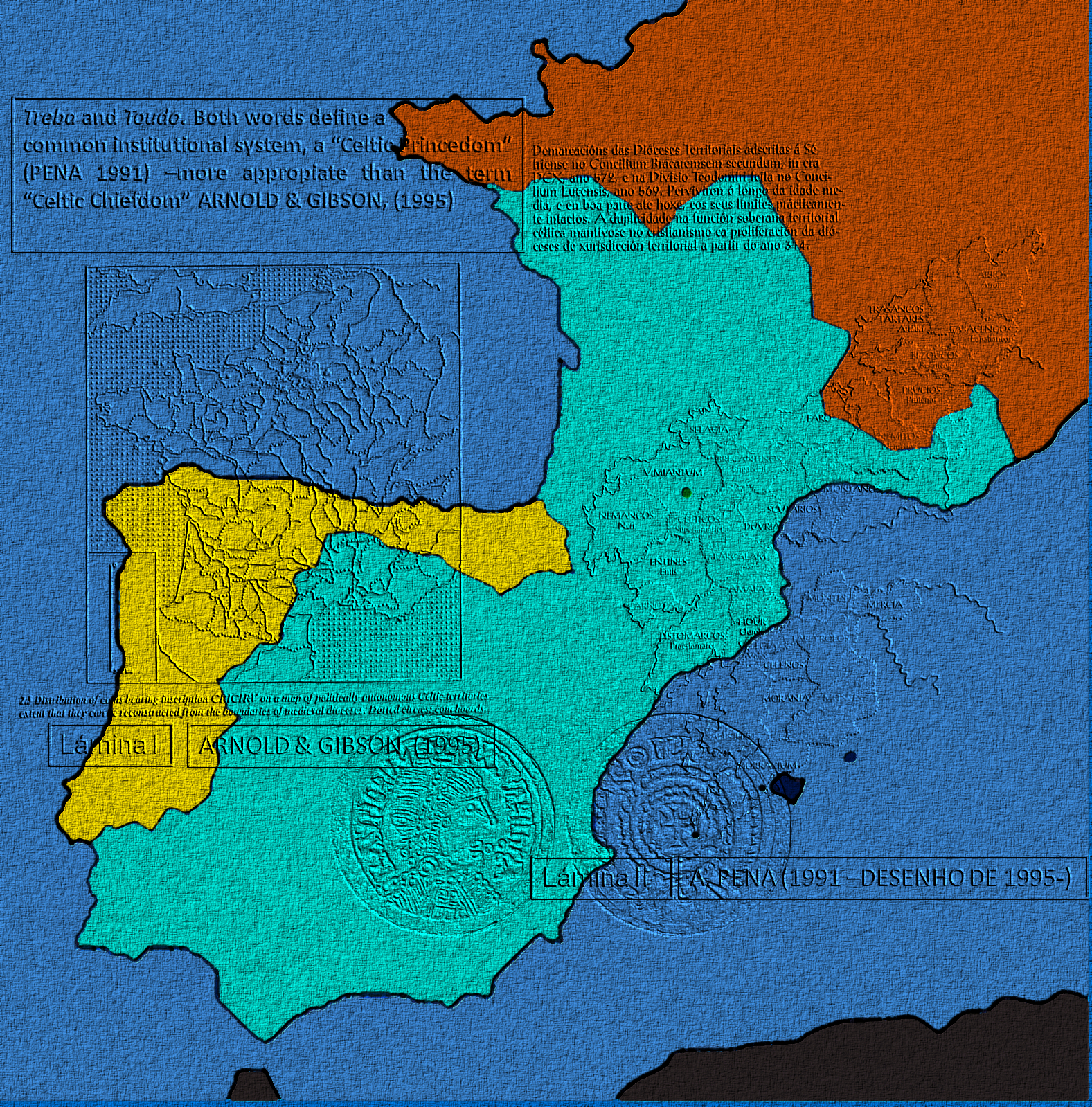 O Noroeste articulábase en unidades territoriales [trebas / toudos / ciuitates / populi / terras] que funcionaban como estados destacando na ‘función soberana’ unha dobre estrutura nas esferas temporal e espiritual e, xunto á existencia dun cabeza nobiliar á fronte do estado *Corono/Princeps [Ari] presente no rexistro epigráfico de quen falaremos máis adiante, detémonos agora na existencia silenciada polas fontes dunha xerarquía relixiosa de jurisdicción restrinxida ao Territorio Político [Terra, Toudo ou Treba] revelada pola constatación, a partir do ano 314, dunha vasta rede de diócesis [rurales, sen vida urbana] superpuestas aos Territorios, que de ningún xeito poderían xurdir como os cogumelos: