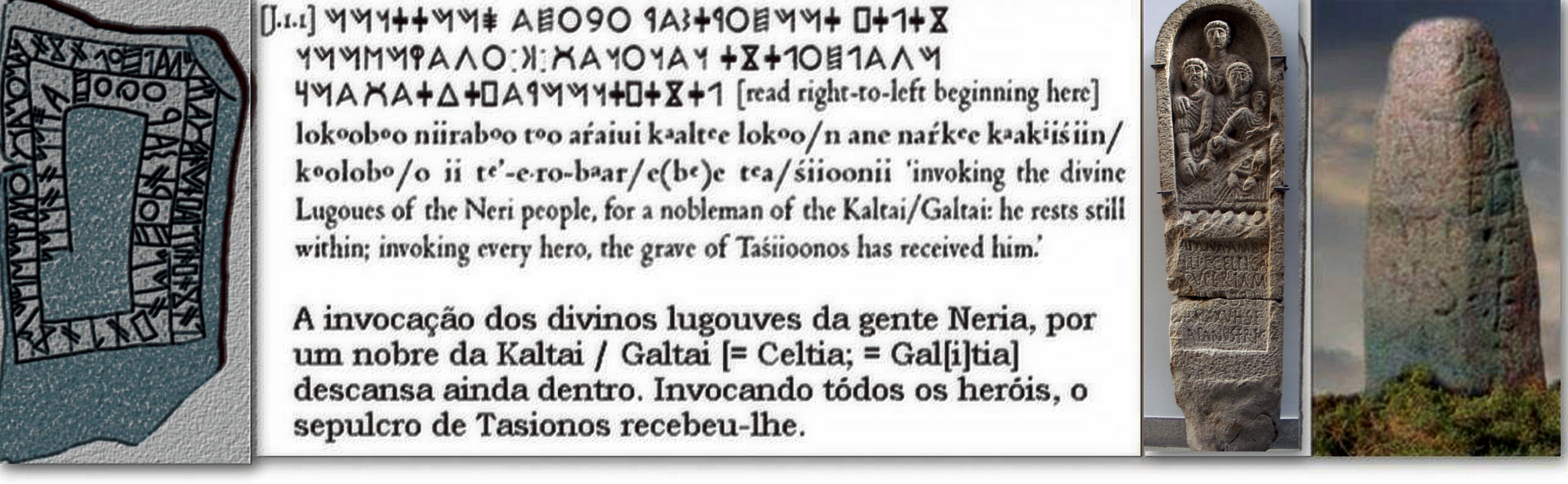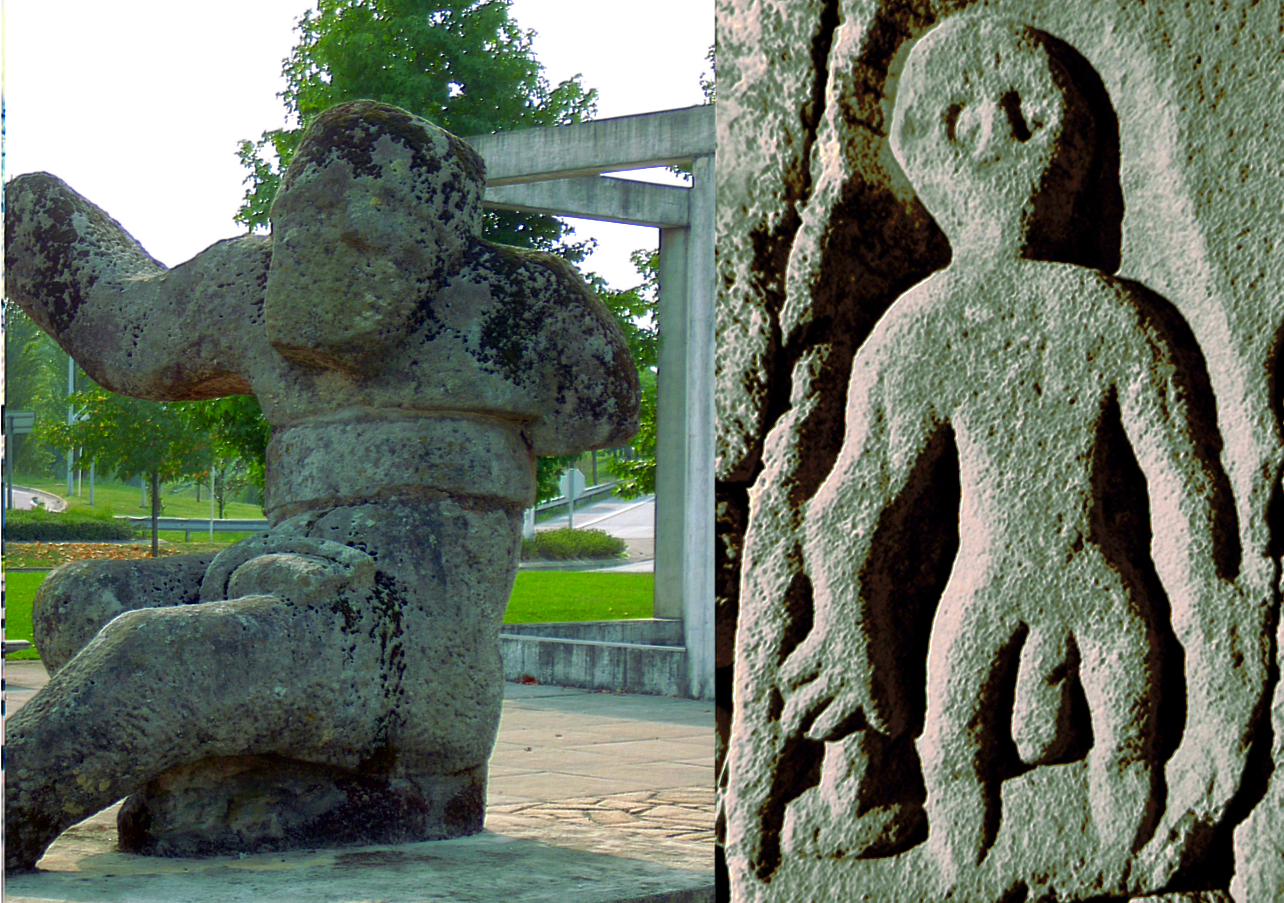 Duas representacións, porque eu também reclamo meu dereito a me equivocar, de Taranis ‘Atroador’ ou Succellus ‘Martelo’, do Deus Tonante galaico. Esquerda. Colosso de Monte Alto, Braga. Dereita. tonante galaico do Larouco [foto M. Gago] conservado na igrexa de San Miguel de Vilar de Perdiçes [Portugal]. Pensa pars pro toto pelo atributo Alfayé [PalHisp 13, 199] no nú retrato do ferreiro lle dando ao mazo sobre perdida estela funerária, e pensa ben que ‘A muller do ferreiriño’ – dinos a pandeirada- ‘non hai muller como ela / de día peta no xunque (bis);/ pola noite peta nela”. Máis a idea dun tonante galaico prevalece, tanto pola presenza da sobredita ara de Perdiçes, adicada a Larauco Deo Maximo (AE 1980, 579) , na parte da aba do Larouco de Gallaecia que atinxe a Galiza de Portugal, non lonxe do famoso santuario rupestre da Pena Escrita, canto a que da outra banda, falamos da parte da aba do Larouco da Gallaecia que nos atinxe a Galiza, española, no lugar de Baltar apareceu, en paredria con noso Deo Maximo, a outra ara dedicada, agora segundo o penso, a outra protagonista, unha luminosa ascensional Virxe, da que falamos demoradamente no primeiro volume [a, 157-172] da que hai constancia, ut supra, ex Orosio, por Prisciliano: a Reve Larouco. Eu penso que o epiteto Re/ve (vogalismo e/i) é psvlm. ‘Rising Moon, Ascendente Lúa’, pois ré- é en antigo gaélico irlandés ‘lúa’ . O ara a dedicou Valerio Aper cumprindo un voto non ao sobredito Deo Larouco, como pensa o comúm, senón a meu cabal entender a Dea Reve Larouco, algo así, si é toleravel, como ‘A Deusa Ascendente Lúa do Larouco’ , a modo, si a comparación é tolerable, de ‘Luminosa Virgem da Asunção (Ascenção) de Larouco’ , en qualqueira casso unha Señora do Ascenso pagana [que cedeu no felíz presente cristián seu lugar, papel e función a nosa Señora da Asunción] recetora do ara: D(EA) REVE /LARAVCO /VALE(RIVS) /APER / EX /VOTO [(Baltar, Our: IRGA IV, 94; AF 111]. Queres unha real probe? Sabes cal é o nome ou advocación da capeliña que en Baltar alberga hoxe o ara? Non cho podes imaxinar?. É evidente en Taranis, Succellus, Tonante galaico [ ut supra a esquerda, Colosso de Monte Alto ou Braga, a dereita. tonante de Larouco], en ambos casos, a hipertrofia, pola conta que lle trae [ao tema virginal], do [inútil] membro e do [inútil] brazo, incapaces de ‘colher’. No trio das Matres, a función soberana da Mater, se personifica na Virgen da Luz, afim se a comparación non é odiosa a Iuno Lucina [a, 159-162] ]. Ascendendo con frecuencia a Virgem da Luz ás alturas do seu, hoxe casi sempre cristianizado, santuario, sito sempre a media ladeira da eminente cume ou Monte Alto, da morada de Deus, do Principe da Humidade, [representado na Terra de Trasancos polo desaparecido Pico do Ouro, complemento esencial da ermida de Chamorro, en Serantes; pola a ermida da Renda en Combarro; polo o hoxe fulminado Pindo sagrado Olimpo Celta etc., etc.] que aspirando á coller a espreita polo ceo. Na cousa do Celta a regra ‘do que presumes careces’ dilue o empalago de Vargas Llosa; de pedra é a nave que mellor flota; guiando a Bon Porto non precisa vista o Ceciegaeco Lar Vial; embarazada de nove meses a rubia Macha superou veloces corcéis; andando apirolado empós da Virgem da Luz súa Larouco, “O [Príncipe da Humidade] do Lañado [monte]” a gota gorda -ensínao Prisciliano- producindo choiva [-como Iuppiter Elicius, de elicio, -is , -ere, -licui, ‘sacar, atraer [as tormentas]’; como o grego Zeus Nafios, [com digamma] de *snau ‘fluente, chorreante’]; segundo o penso eu, en seu Monte Alto o Coloso de Braga, brama e atroa ‘coa picha feita un lío’ [ou un cinto], a inútil extensión do protésico brazo [de prata, airgetlán Nuada, raíz Pok. IEW 768 *neu-d ‘suxeitar atinxir con esforzo’ (Pena 1991)] incapaz de colher, como colhe o galego da Arxentina- tan radiante Virxe. ‘E ti telo telo / non mo queres dar / e logo, de vella /o podes salgar’. Cantiga popular. [Así funcionan estes epítetos [confundidos, mos pesimus, con deuses] na Relixión Celta [r, 167-273 ].