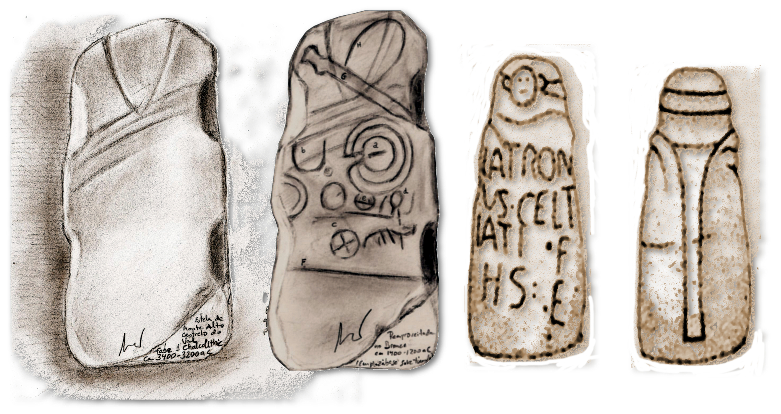 Druida de Paderne. Deseño de Carlos Alfonzo, dirixido polo autor. Esqueda, dous deseños do profesor Luis Montagudo García de sendas Trebopalas