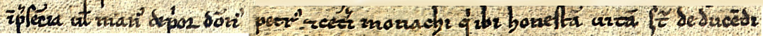 Ut vivat in ea Petrus Presbiter donec veniat ad aetatem intelligibilem ille filius fratris mei Hoveci Pelagii et iterum vivat in ea et serviat cum ea Superaddo in vita sua si tantum legerit, sed si clericus non fuerit non ei detis, set reservetur cum omnibus supernominatis hereditatibus sepe dicto (supradicto?) Monasterio. Et quavis legat aut ordinatus sit, non habeat licentiam vendendi eam alicui homini aut alienandi, sed vivat in ea cum consilio et adiutorio fratrum Superaddi, et ad obitum suum relinquat eam Superaddo […]