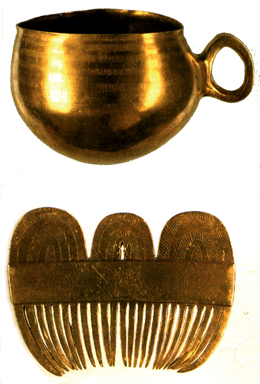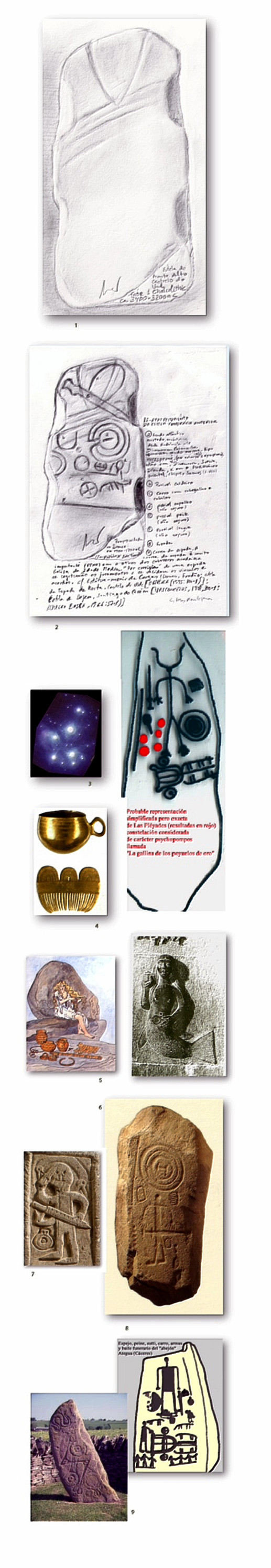 Pars pro toto o inventario post mortem dos objetos depositados no túmulo do caballero, se representa nas estelas funerárias Atlánticas desde a Idade do Bronze S. XIV a.C. até o período Tardo Antigo, século VII d. C., como sucede com o espelho e o dourado peite para a Moura ou Mulher Mariña (Pena Graña), que num dia, o escolheu na Trebopala para reinar; e, aguarda-o a sua morte no seu reino do Mar Moiral, ou Alén para compartilhar com ele o reino e seus tesouros. Mas esta tradição mantida nas heráldicas até hoje do peine e do espelho da Muller Mariña Quando nasceu? O áureo peine calcolítico de Caldas, permite intuir, sendo conservadores, [em clave PCP] de continuidade uma origem Neolítica.