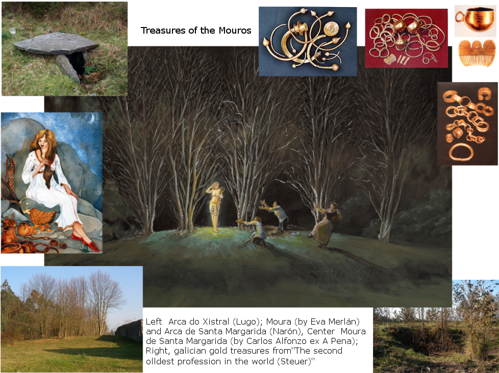 A núa Moura sorprendida no xusto momento onde sae a asollar seu ouro e tesouros sobre as mámoas chamadas en Narón “Montiños da [A]Moura, ou, na fría Fontana próxima onde vai lavar os cabelos [Fonte da Moura], asalta ao cabaleiro, ou ao mozo, someténdolo a unha proba encuberta consistente en elixir o de mais valor. Si o mozo rexeita o ouro e escolle a Moura pasa a proba. Entón a descabelada moura – ter solto o cabelo era considerado na antiguidade unha provocación- propiciará o encontro amoroso, non ofrecerá resistencia, consumándose o matrimonio entre o rei e A Moura ou Deusa Soberana. En clave de Xeografía Mítica o interese demarcatório destas mámoas fundacionais no lugar do encontro que lexitiman á linaxe rectora da Terra, é inmenso.