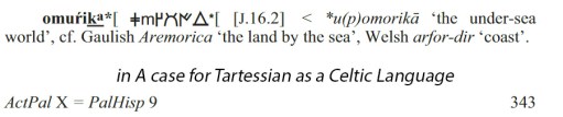 Seguramente, de omuŕ+i+ka* [J.16.2] < *u(p)omorik_ª , segundo J. T. Koch-: ‘o submarino alén” , “the under-sea world’, cf. Gaulish Aremorica ‘The Land by the Sea’, Welsh arfor-dir ‘coast’.