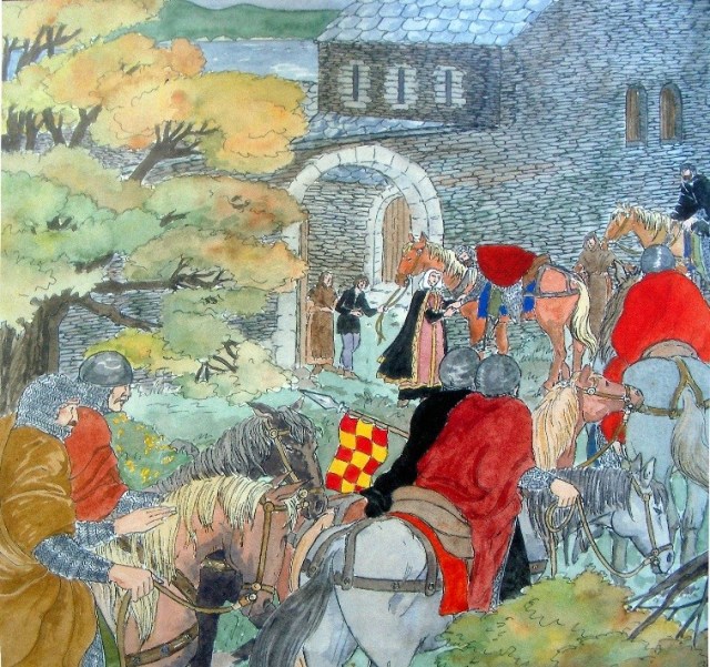 Esta bellísima lámina realizada por Eva Merlán Bollaín para a História Ilustrada de Narón, referente em seu gênero, mostra a volta milagrosamente salvada por intercesión de San Martinho -depois de perder a cruenta batalha da cristiandad ontra os Almorávides em Sacralinas o 23 de Outubro do ano 1086 – do conde Froila Petriz Bermúdez. Chegou 18 dias despues da derrota piedoso conde a seu monasterio e panteão familiar de Juvia a cumprir a promessa e voto, doando a uilla domini Mironi, “Domirón” -hoje os bairros de “San José Obrero” e A Faisca-, sua mais preciosa posse.
